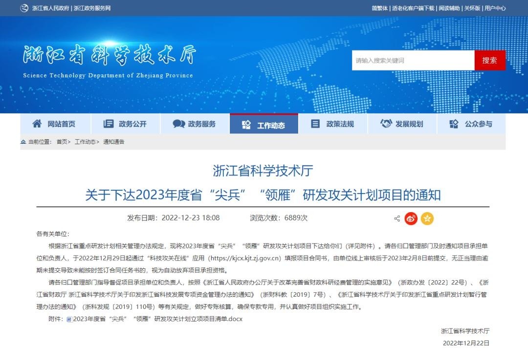 “尖兵”“領(lǐng)雁”研發(fā)攻關(guān)計(jì)劃由省級(jí)財(cái)政資金設(shè)立,圍繞建設(shè)“互聯(lián)網(wǎng)+”、生命健康和新材料三大科創(chuàng)高地和搶占“碳達(dá)峰、碳中和”技術(shù)制高點(diǎn),聚焦十大標(biāo)志性產(chǎn)業(yè)鏈、未來(lái)產(chǎn)業(yè)等重點(diǎn)領(lǐng)域,兼顧社會(huì)公益等重大技術(shù)需求,在全省范圍內(nèi)公開征集榜單。入選省級(jí)“尖兵”“領(lǐng)雁”計(jì)劃,彰顯了我司的科研攻關(guān)、科技創(chuàng)新綜合實(shí)力。