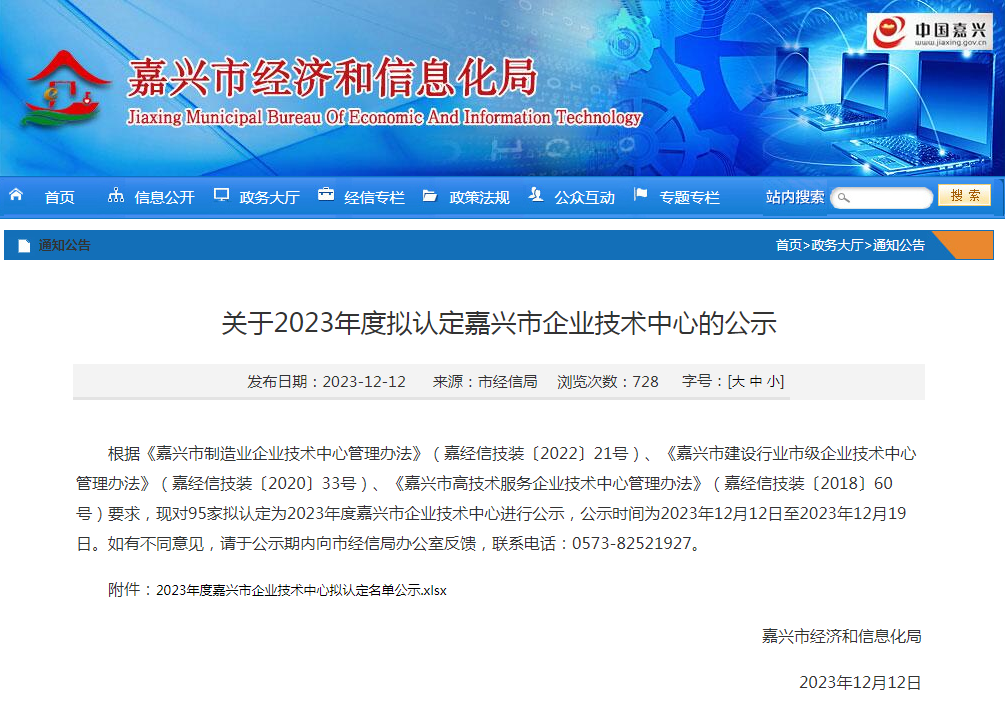 2023年12月12日,嘉興市經濟和信息化局發布了《關于2023年度擬認定嘉興市企業技術中心的公示》,對95家擬認定為2023年度嘉興市企業技術中心進行公示,浙江嘉華特種尼龍有限公司企業技術中心上榜。