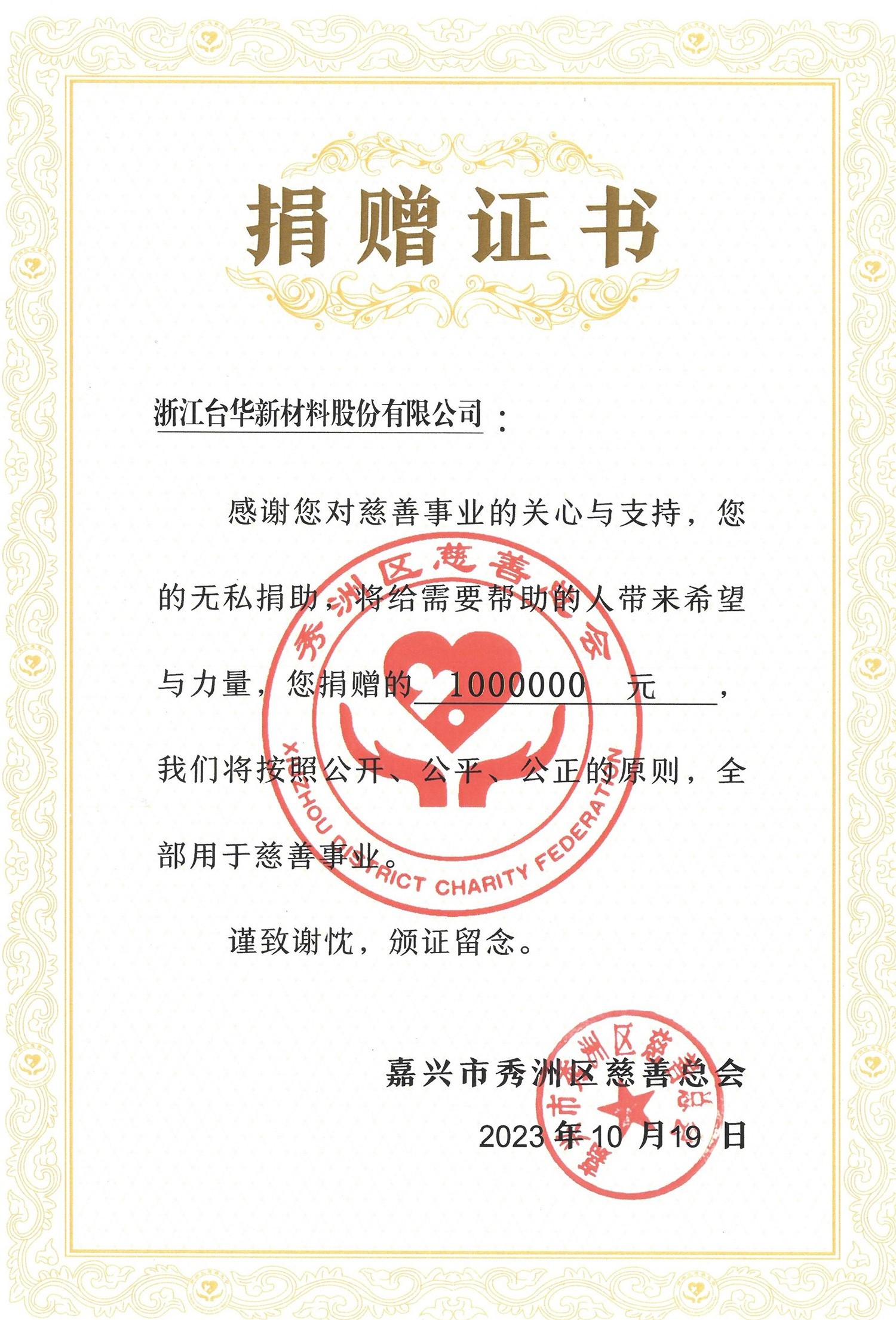 2023年慈善捐款100萬元